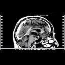 Click on sagittal image to select slice. Click on thin tickmark to change timepoint, or thick tickmark for overlay.