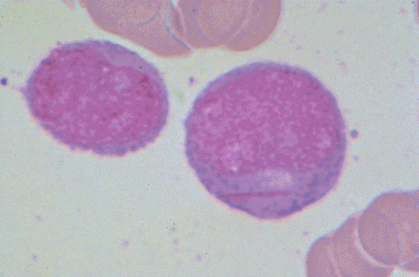 peripheral blood in a patient with ANLL M3, hypogranular. Two abnormal