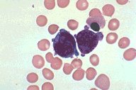 peripheral blood in a patient with ANLL M3. Two hyperbasophilic cells