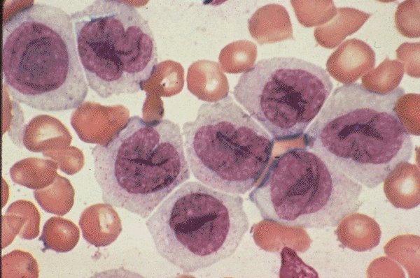 ANLL M5B: The monocytoid cells in this peripheral blood smear, at low oil magnification, show much more mature monocytic nuclei.