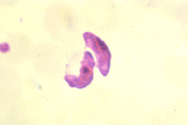 Plasmodium falsiparum: This photomicrograph shows two crescent shaped gametocytes.