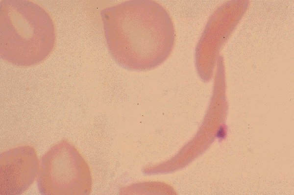 This Wright's stained peripheral blood smear shows sickle cells in a patient with homozygous sickle cell disease.