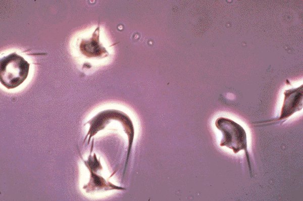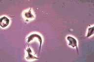 This low oil magnification is of a polarized phase microscopic view of permanently sickled cells.