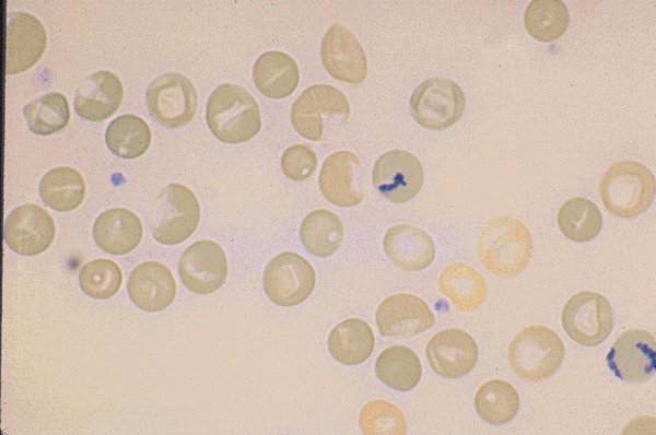 material in the erythrocytes stains a dark bue.
