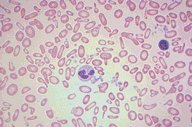 anemia. A normal lymphocyte and neutrophil are seen in the field as well.