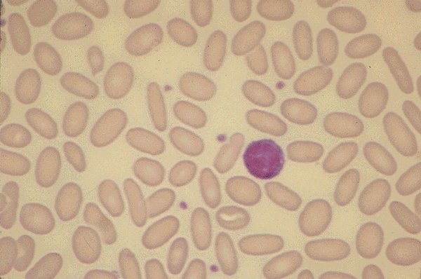 Hereditary elliptocytosis: A normal lymphocyte is seen, as are