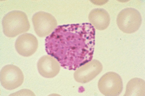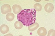 This high oil photomicrograph shows a normal basophil in the peripheral blood.