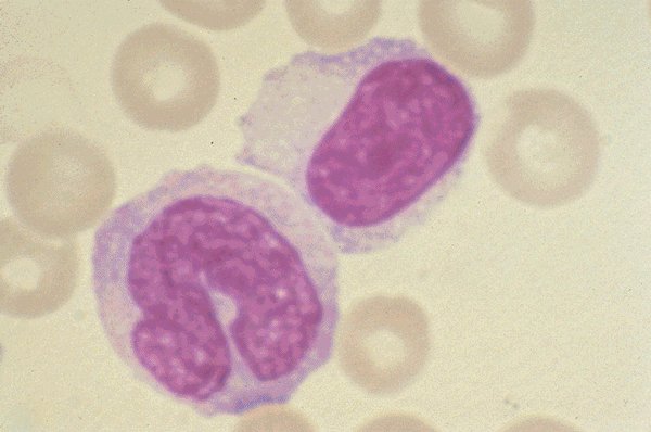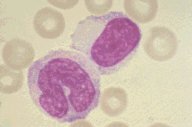 A normal monocyte and a large lymphocyte are seen in this high oil magnification of a Wright's stained peripheral blood smear.