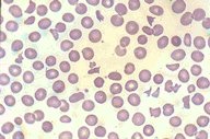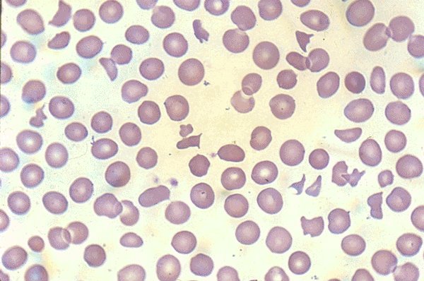hemolytic anemia. Fragmented blood cells are clearly seen in this field.