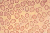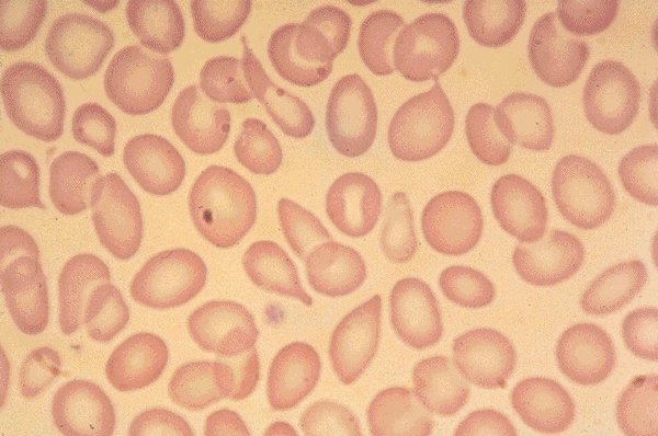 in their degree of hemoglobinization. Several teardrop cells are seen