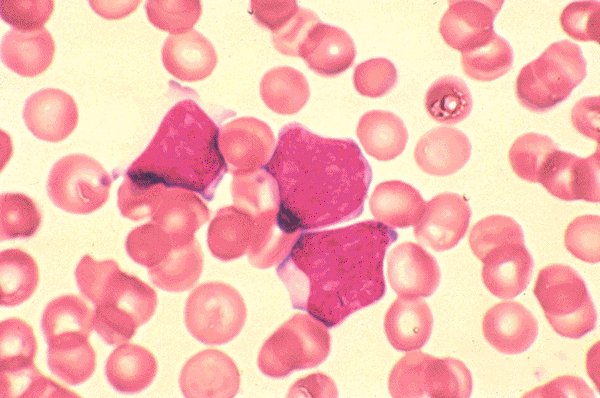 Three lymphoblasts in the peripheral blood of a