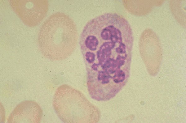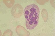 Pernicious anemia. Marked neutrophil hypersegmentation is seen in this high-oil magnification field.