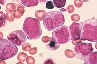 Acute non-lymphoblastic leukemia (M4). The neoplastic blasts in the center of this field have both monocytic and myeloid features.