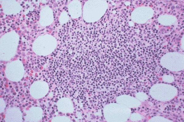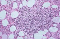 This very low power view of a bone marrow biopsy, stained with H&E, shows a normal lymphoid aggregate. The location is not paratrabecular.