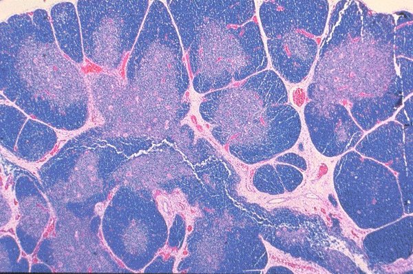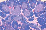 This H&E stained view is of a thymus gland from a newborn. The cortical and medulary areas can be appreciated.